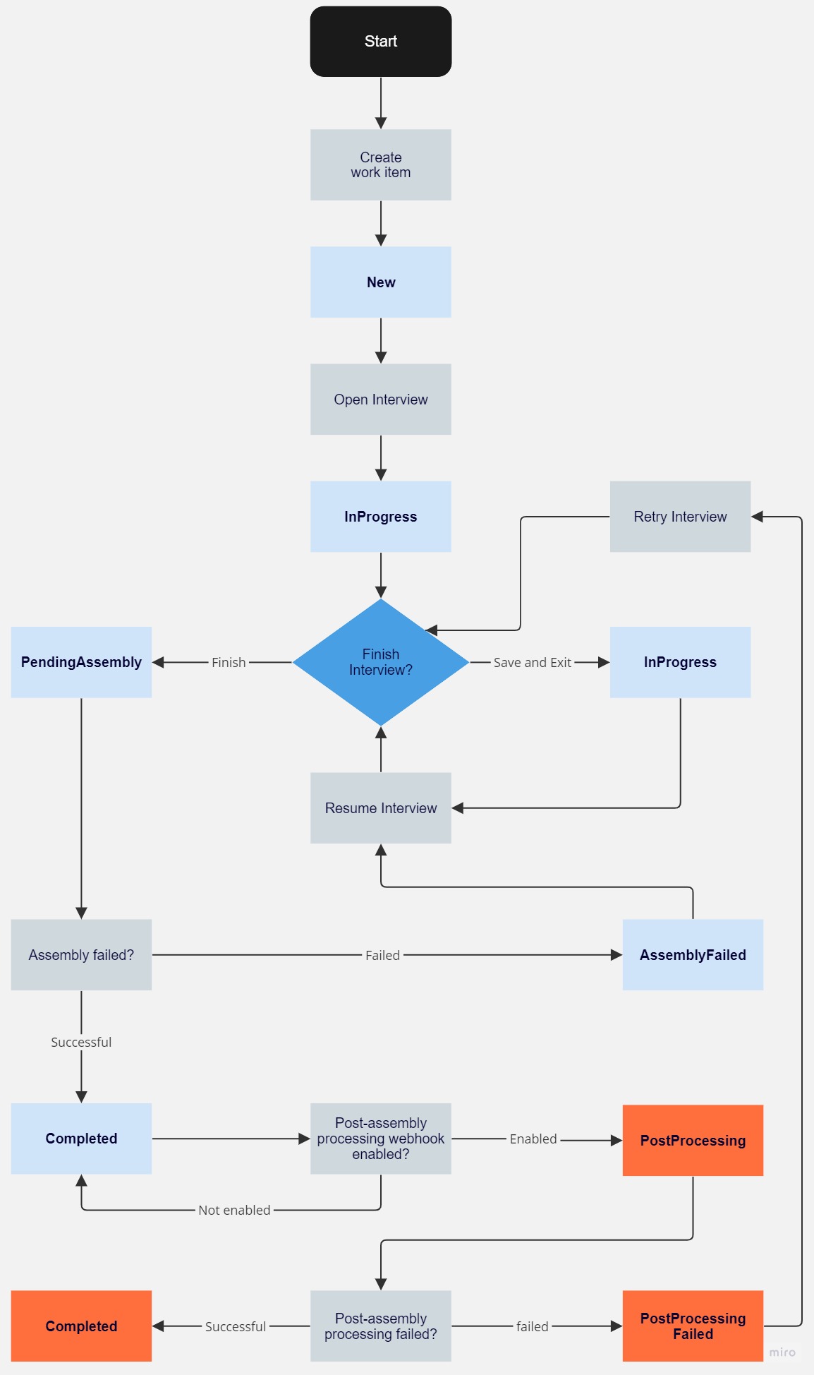 For example, when a user creates a new work item, launches an interview, and then returns to the work item details pane before finishing the interview, the status in progress will be displayed in the work item details pane.
