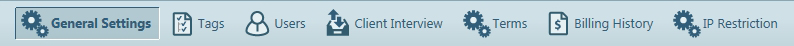 Taskbars provide a submenu to functions available on the active page, such as the ability to create a new user or document. The submenu of the Settings tab, for example, consists of the following Adminstrative areas: General Settings, Tags, Users, Client Interview, Terms, Billing History and IP Restriction.