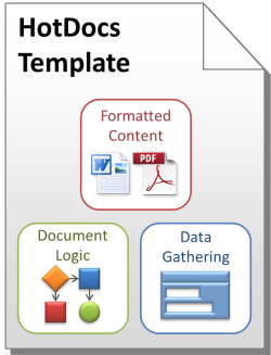 A HotDocs template is a software component created using HotDocs Developer. The template contains all of the document's boilerplate text (the parts of the document which remain the same every time the document is generated), the variable fields (which will be replaced with new information collected during the interview), and any template logic needed (this can be repeated fields, conditional paragraphs, inserted templates etc.). The HotDocs template and the paired HotDocs component file (generated by HotDocs alongside the template) contain all the information necessary to produce multiple documents with the information gathered in a HotDocs interview.